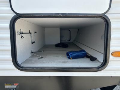 Head to the lake in this travel trailer with a large slide out for more space and comfort and additional sleeping space provided by the double-size bunks! Once you arrive, you can put out the 16' power awning, unload the pass-through storage, and make lunch on the outdoor kitchen with a pull-out griddle and refrigerator. The booth dinette inside can be used as dining space, and there is storage underneath here for added convenience. You will also find a full interior kitchen, and the full bath includes one of the dual entry doors for added convenience. When you're ready for some shut-eye, the king bed in the front private bedroom will feel just like home. There are also dual wardrobes and nightstands to keep your things tidy!