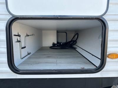 When you are wanting a little more interior space in your next travel trailer, take a look inside! This large slide out widens the main living space so you can easily make meals using full amenities without having to move for someone walking from the front bedroom and walk-through bath to the U-shaped dinette in the back. For sleeping, there is a king-size bed with storage on both sides at the very front of this unit giving you privacy from the rest, and even a private second entry/exit door from within the bedroom. You will find storage beneath the bed for larger items or extra blankets, plus a space saving sliding door. The U-shaped dinette and jackknife sofa offer comfortable seating as well as extra sleeping space for overnight guests, and the fireplace is just a nice feature to enjoy. On the outside, an 18' awning provides a large outdoor living area protected from the elements, and the oversized pass-through will house all of your exterior gear like lawn chairs, outdoor games and rugs, plus so much more!